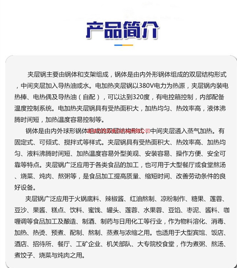 夹层锅 应用于糖果、糕点、饮料、果汁、果酱、蜜饯、乳品与罐头等食品加工及酿造、制酒、制药与日用化工等行业。作为物料溶化、消毒、加热、热烫、预煮、配制、熬制、蒸煮与浓缩之用。适用于大型宾馆、饭店、酒店、招待所、餐厅、工矿企业、机关部队、大专院校食堂作为煮粥、熬汤、煮饺子、烧菜与炖肉之用。