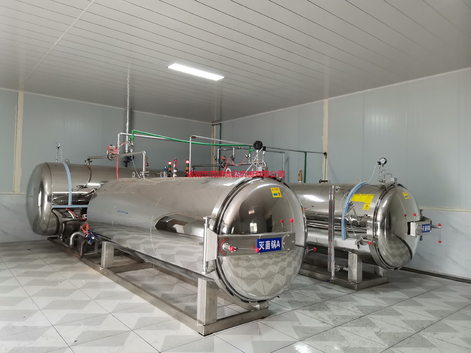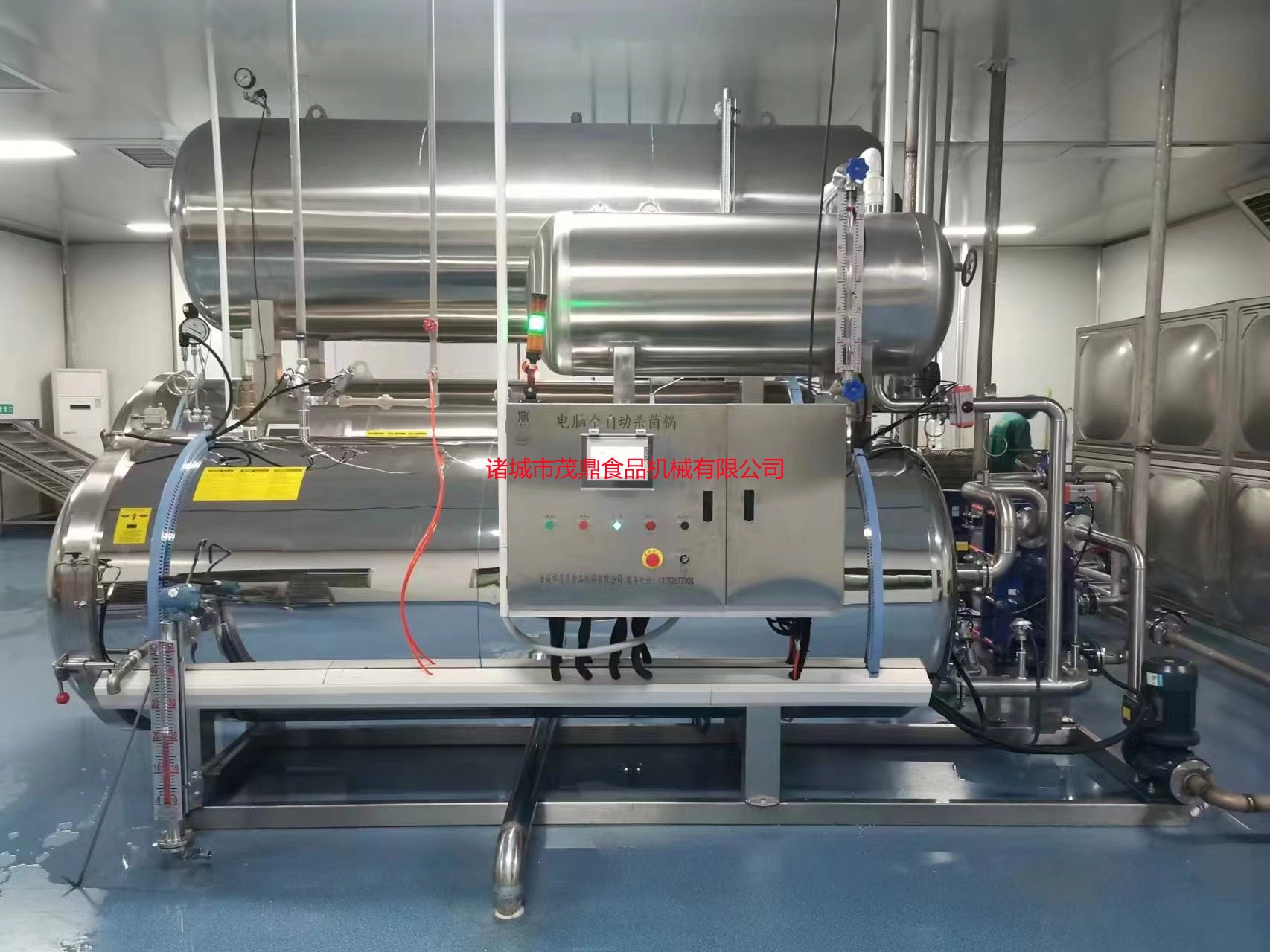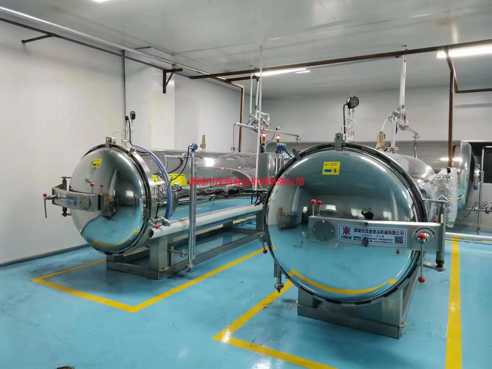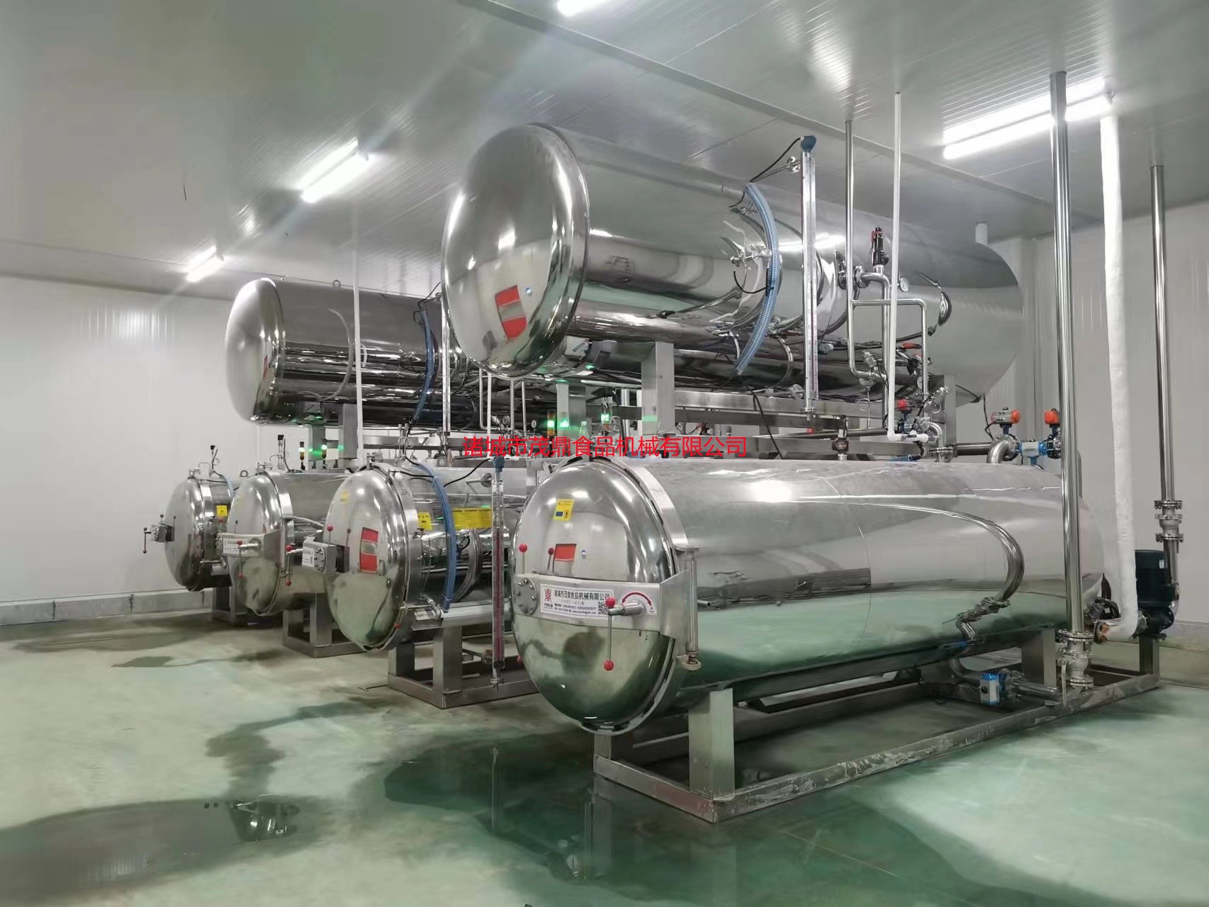 杀菌锅由锅体、锅盖、开启装置、锁紧楔块、安全联锁装置、轨道、灭菌框、蒸汽喷灌及若干管口等組成。锅盖密封采用充气式硅橡胶耐温密封卷,密封可靠,使用寿命长。具有受热面积大,热效率高、加热均匀、液料沸腾时间短、加热温度容易控制等特点。双层杀菌锅比单层杀菌锅效率提高一倍,节约能源和杀菌时间,适用于一天多次杀菌的食品厂家。在杀菌过程中,应注意最初排气,进而泄气,使蒸汽流通。亦可每各10 分钟放气一次,促进热交换。总之必须满足杀菌条件的规定,按一定程序进行,杀菌温度的高低,杀菌压力的大小,杀菌时间的长短和操作方法等均由不同产品的杀菌工艺作出具体规定。
