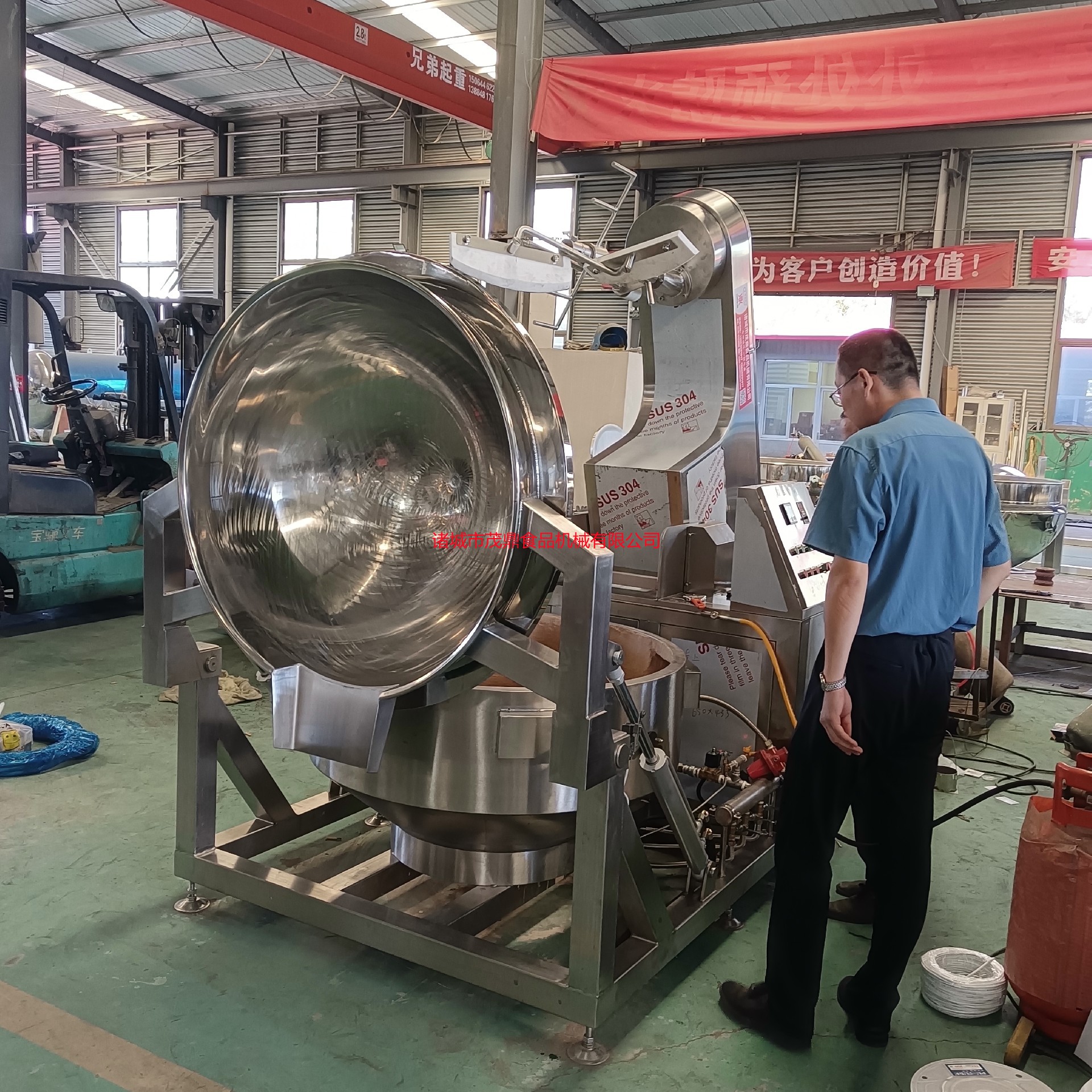 行星炒锅具有受热面积大,热效率高的特点。安全性突出:本产品凡接触食品部分皆为食品级SUS304不锈钢制造。适合多种空间便于拆具有造型美观、设计合理、结构紧凑、安装方便、操作简单、便于维修。搅拌方式卸:搅拌方式采用特殊的倾斜式传动,使用的行星式搅拌器与锅体充分接触。搅拌系统采用自转公转相结合的方式,其传动比为不整数传动比,保证锅内无任何搅拌盲点。干净卫生:使用先进的传动与密封结构,使传动部分与锅内洁净、卫生。倒料方便轻松:该系列设备是利用液压推力使搅拌臂翻转,免拆装搅拌器,再利用液压推力倾翻锅体,易于进出原料节省人力。